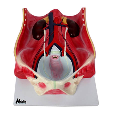 3| El modelo muestra las estructuras de la cavidad retroperitoneal, pelvis con los huesos y los músculos, la vena cava inferior, la aorta con sus ramificaciones, el tracto urinario superior, riñón con glándula suprarrenal, uréter, vejiga, etc.