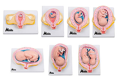 Modelo compuesto por 8 representaciones a tamaño natural que ilustran el desarrollo del feto humano desde la cuarta semana al sexto mes de embarazo.