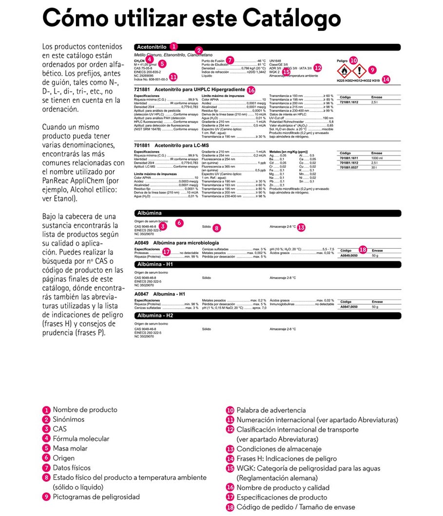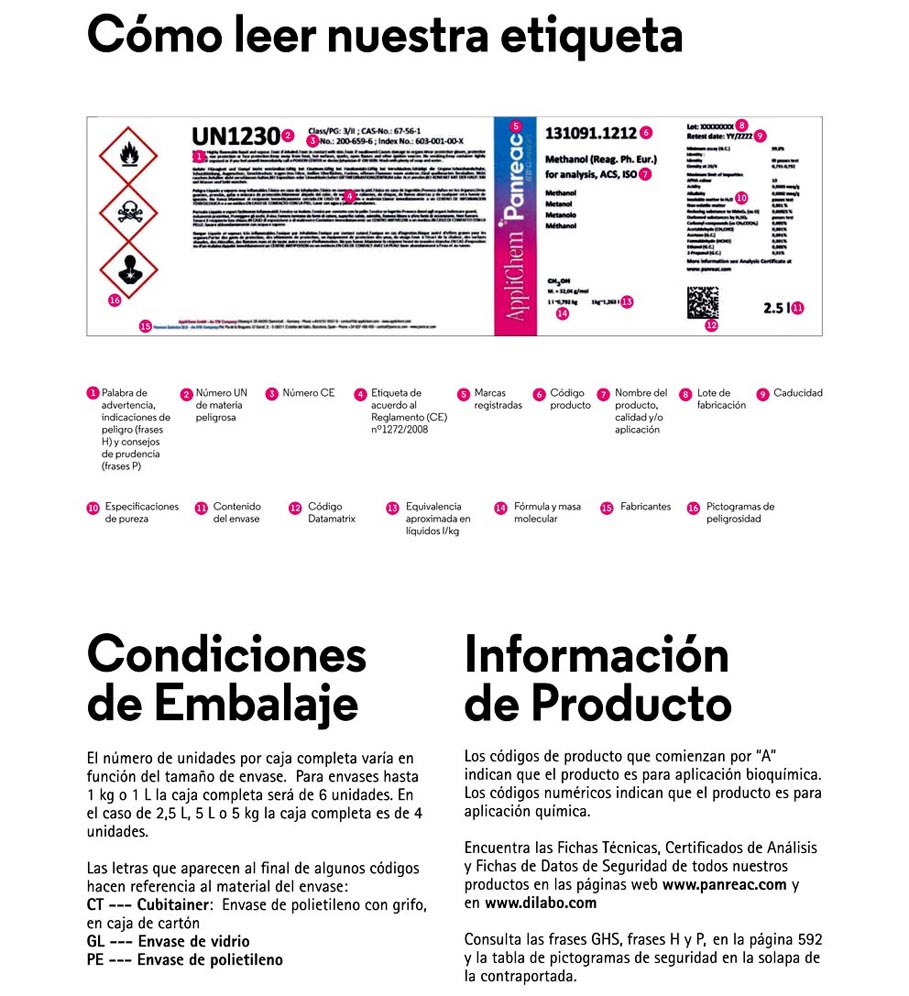 Las sustancias PanReac AppliChem contienen información útil como las especificaciones de producto, información química general o sinónimos, y sobre la calidad o la aplicación, tamaños de envase, pictogramas, frases de peligrosidad e información sobre transporte.